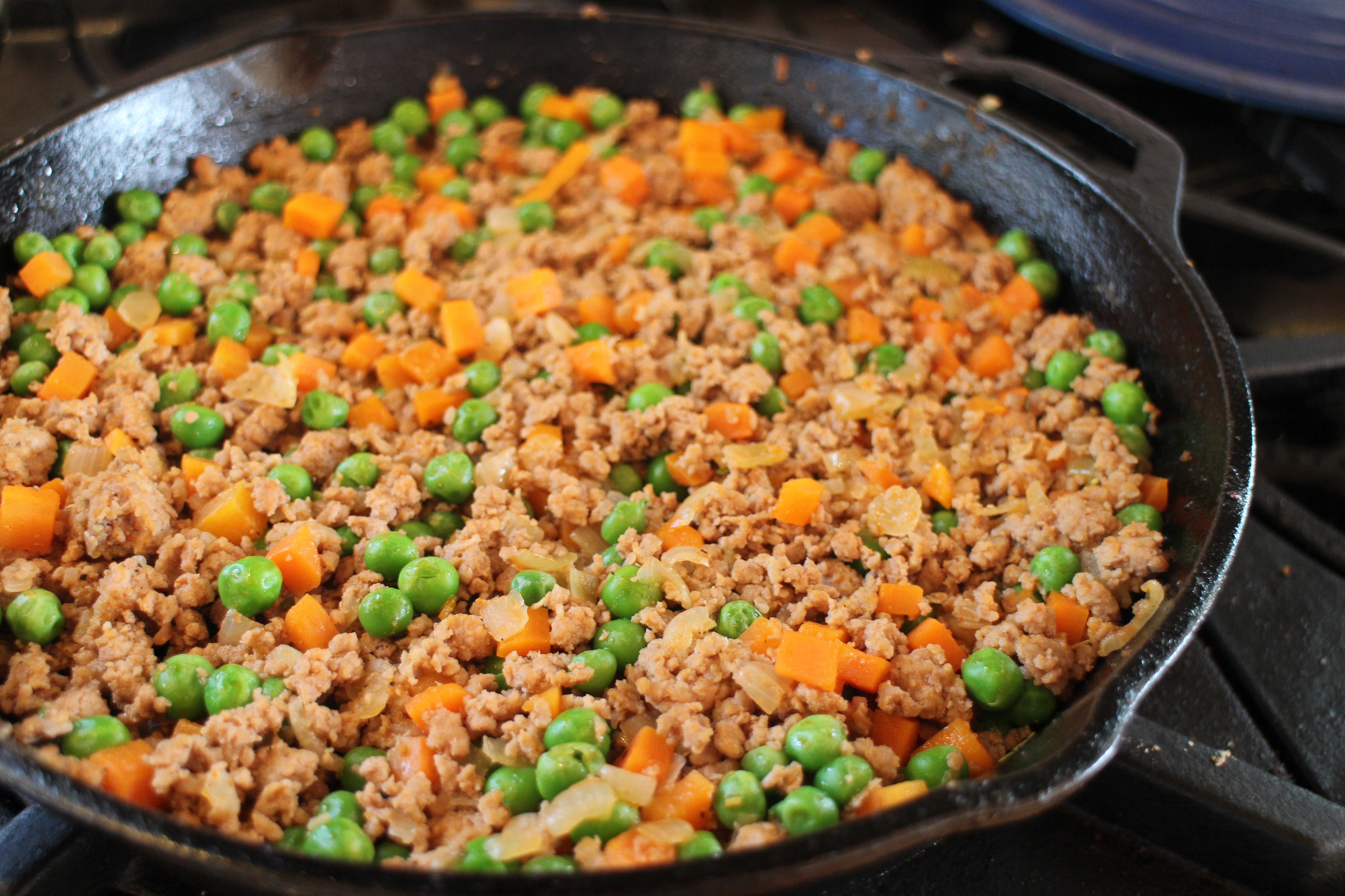 Our version starts with a pork, carrot, and onion base that is flavored with maple syrup and rosemary, lending a sweet and savory flavor to the meat. Think: good breakfast sausage but with more depth of flavor. The pork, carrots, and onion are sautéed until the meat is browned. Once the fat is spooned off, we add some tomato paste, maple syrup, rosemary, and chicken stock, letting that cook for an additional ten minutes to let the mixture thicken. We add frozen peas and then get to work on the topping.