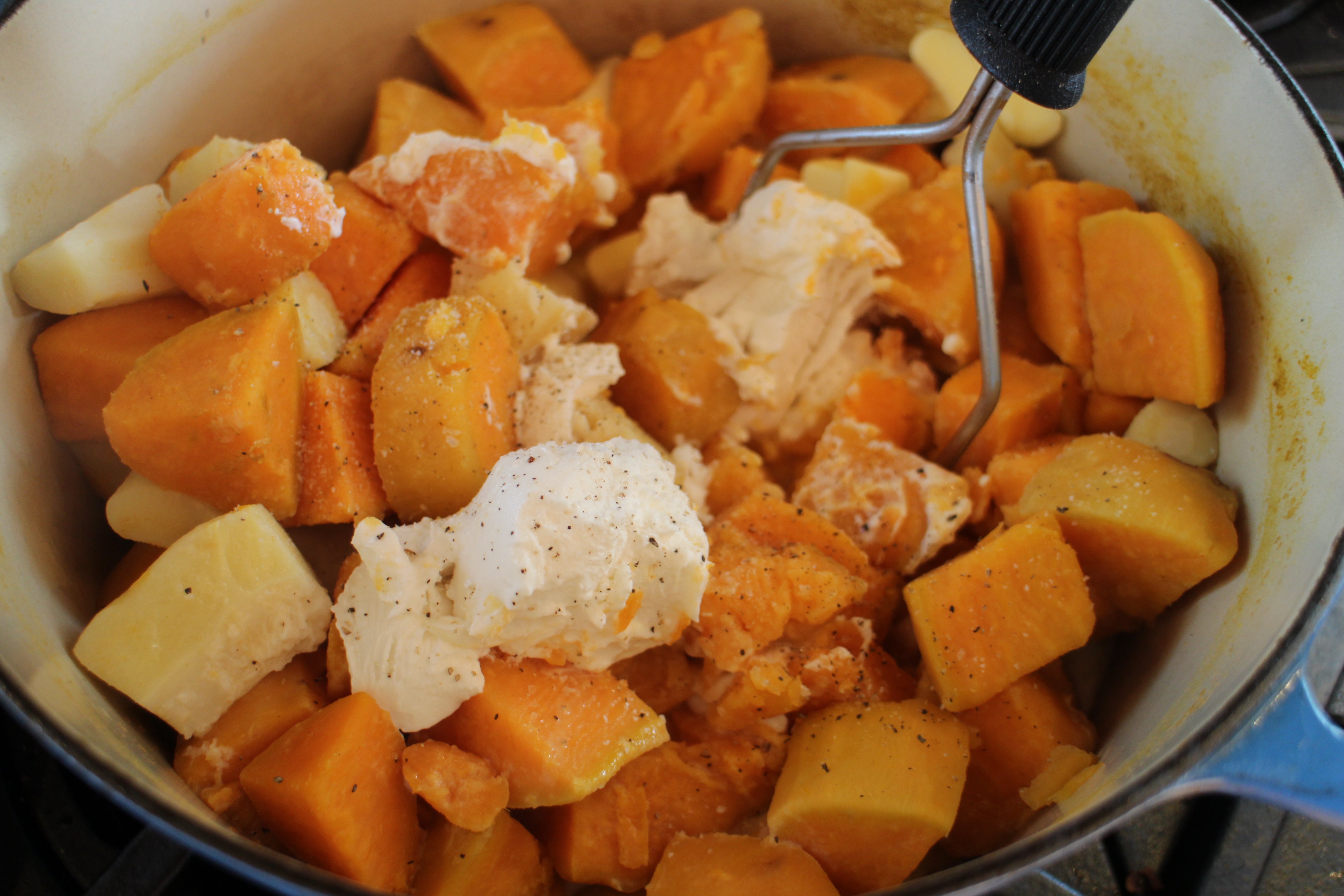 A topping of traditional mashed potatoes would also be delicious on this variation of Shepherd's Pie butwe wanted to create something a little more visually interesting and flavorful without creating more work. We settled on a mixture of mashed sweet potatoes and parsnips, mixing in just enough butter and cream to add richness and heft. Our secret ingredients in the topping are more maple syrup and a generous helping of goat cheese from our friends at Vermont Creamery. Those get mixed together and can be added to the top of the meat stew as is or, for a fancier presentation, can be whipped in a blender or food processor. We used our trusty immersion blender right in the pot to finely blend about half of the overall mixtures, giving the mashed potatoes a slightly more refined appearance.