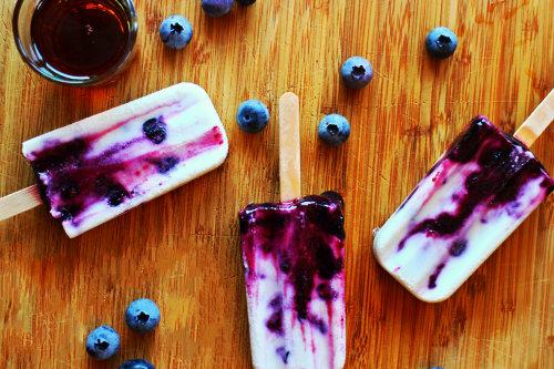 - Fill popsicle molds 3/4 full with yogurt mixture. Spoon in blueberry sauce on top and gently push down into yogurt leaving 1/4 – 1/2 inch of space on top of mold to allow for expansion in freezing process. Freeze for 3-4 hours and enjoy!