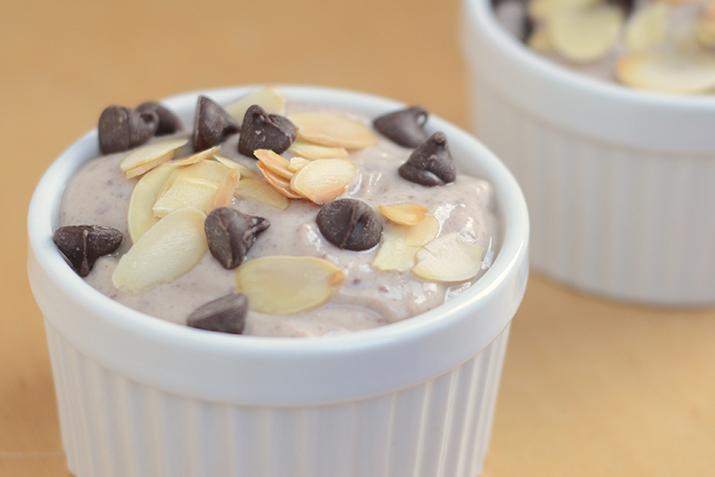 - In a food processor, puree the tofu, maple syrup and vanilla until smooth. Microwave half the chocolate chips for 40-60 seconds and stir to blend. Add the melted chocolate and half the sliced almonds to the tofu mixture and blend until smooth. Remove from the food processor and stir in the remaining almonds and chocolate chips. Refrigerate 30 minutes until firm. Serve as a dessert or topping.